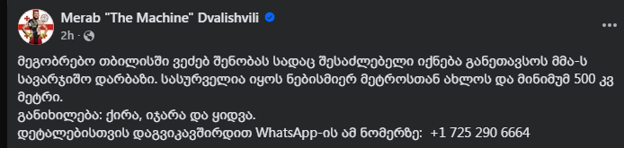 "მეგობრებო თბილისში ვეძებ შენობას სადაც შესაძლებელი იქნება განეთავსოს მმა-ს სავარჯიშო დარბაზი. სასურველია იყოს ნებისმიერ მეტროსთან ახლოს და მინიმუმ 500 კვ მეტრი.