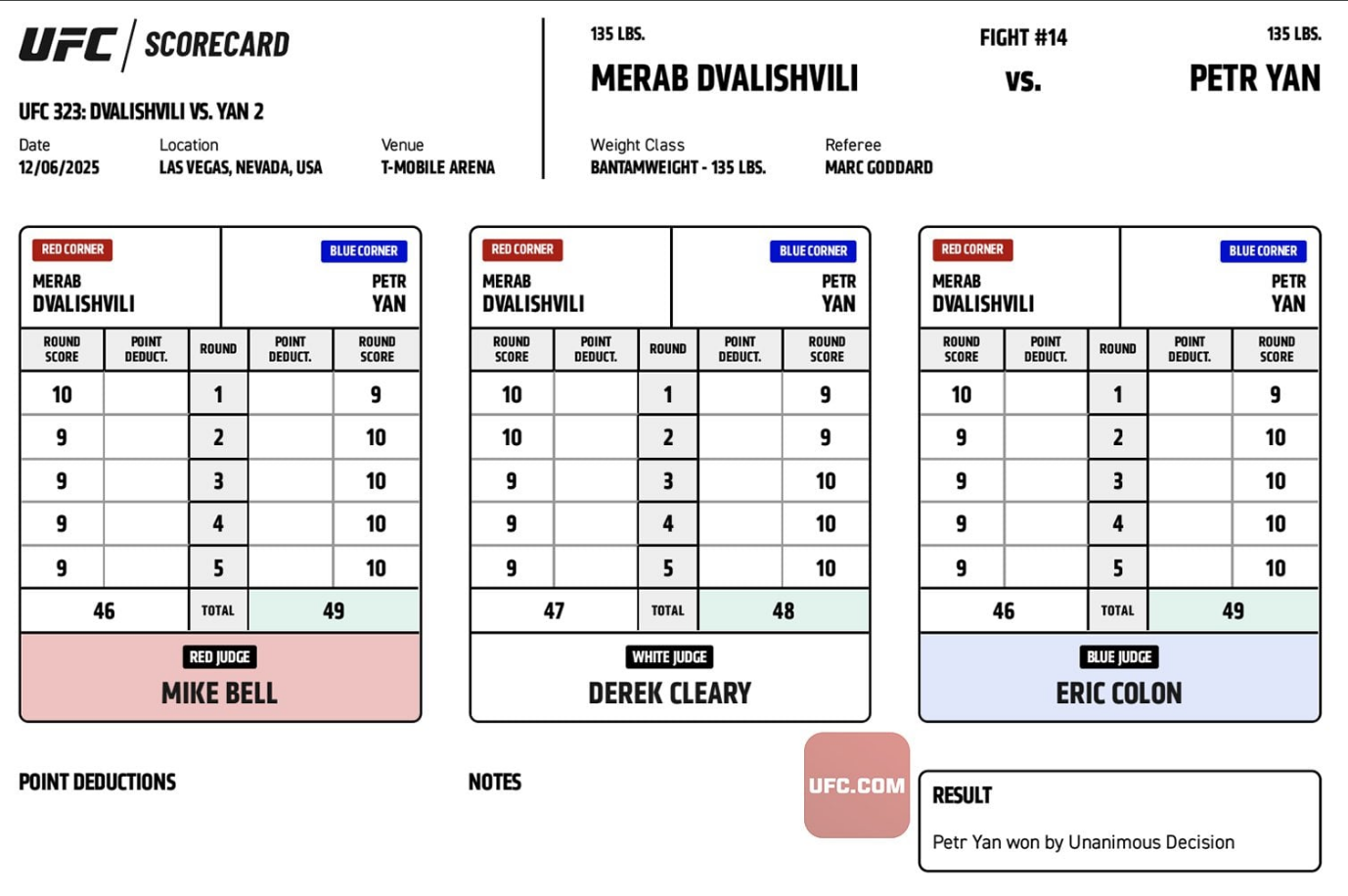 საბოლოო ჯამში, მსაჯების ქულები ასე გადანაწილდა: მაიკ ბელმა და ერიკ კოლონმა ბრძოლა 49-46 შეაფასეს, ხოლო დერეკ კლირიმ — 48-47. გამარჯვება ერთსულოვანი გადაწყვეტილებით პეტრ იანს დარჩა.
