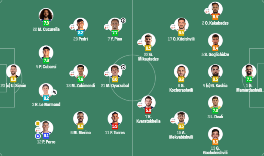 ცნობილია - რა შეფასებები მიიღეს ქართველმა ფეხბურთელებმა ესპანეთთან მატჩში