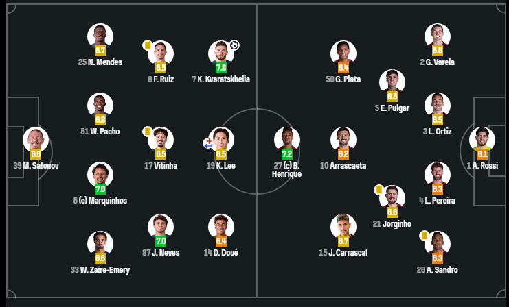 აღსანიშნავია, რომ შეხვედრის პირველ ტაიმში ერთადერთი გოლის გატანა ხვიჩა კვარაცხელიამ შეძლო და SofaScore-სგან 7.8 შეფასება მიიღო.