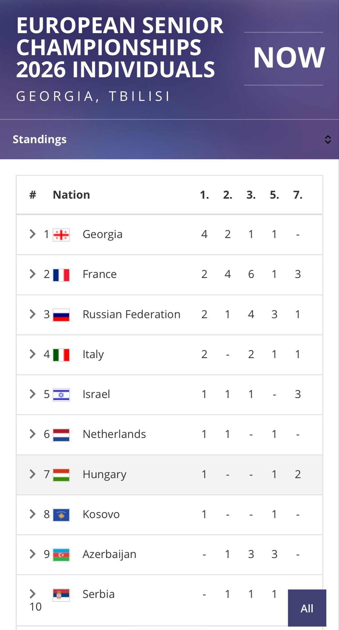 თბილისში გამართული ძიუდოს ევროპის ჩემპიონატის საბოლოო გუნდური შედეგი ასე გამოიყურება:
