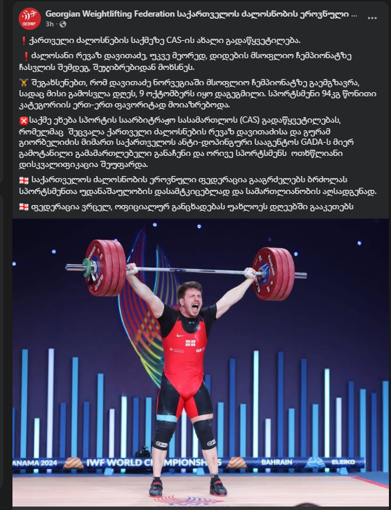 გადაწყვეტილება სპორტულმა საარბიტრაჟო სასამართლომ (CAS) გამოიტანა, რომელმაც საქართველოს ანტი-დოპინგური სააგენტოს მიერ გამოტანილი გამამართლებელი განაჩენი შეცვალა.